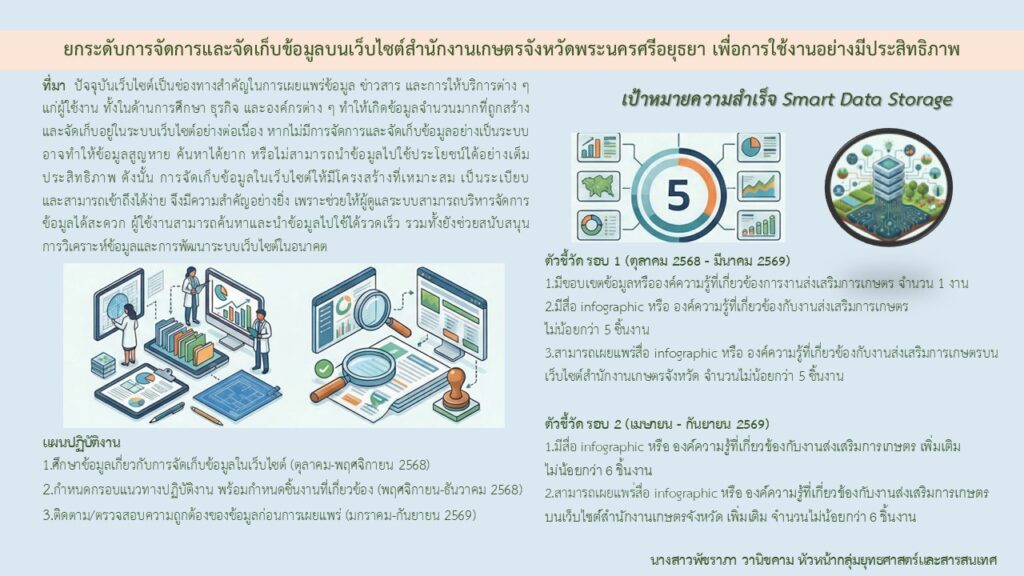 ประเด็นท้าทาย กลุ่มยุทธศาสตร์และสารสนเทศยกระดับการจัดการและจัดเก็บข้อมูลบนเว็บไซต์สำนักงานเกษตรจังหวัดพระนครศรีอยุธยา เพื่อการใช้งานอย่างมีประสิทธิภาพ ayutthaya_doae / 20/03/2026