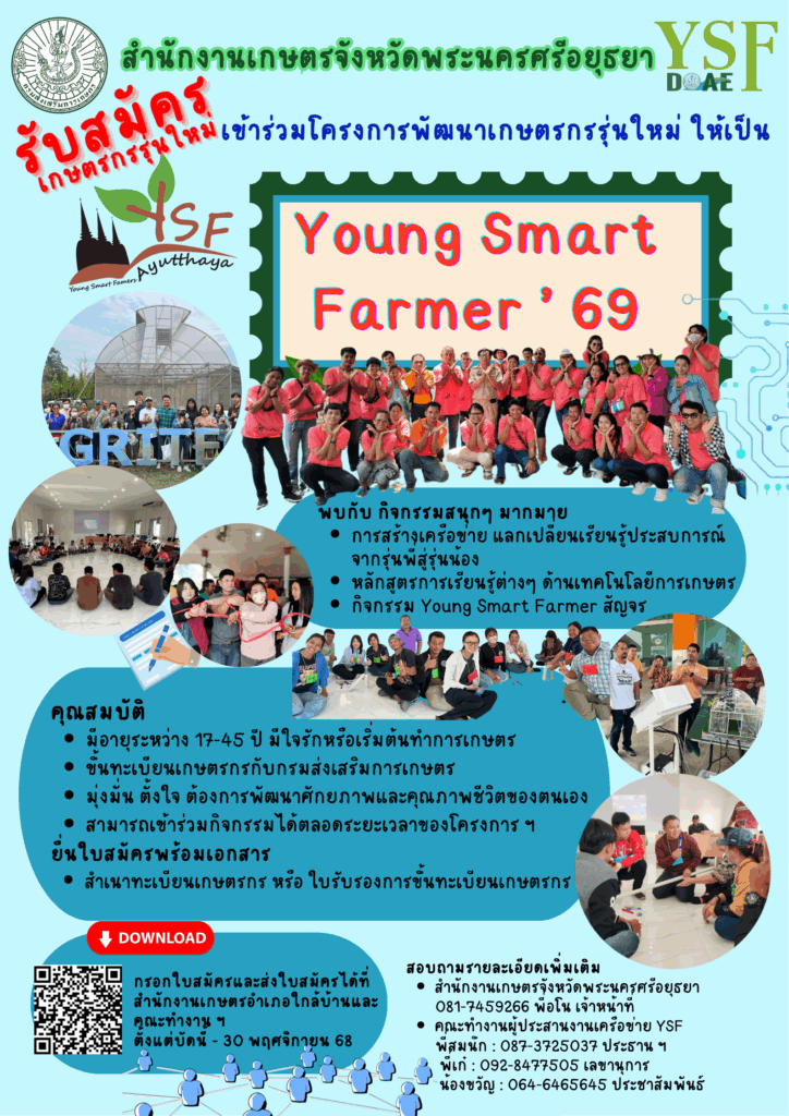 ข่าวประกาศ/ประชาสัมพันธ์สำนักงานเกษตรจังหวัดพระนครศรีอยุธยา เปิดรับสมัคร Young Smart Farmer ประจำปี 2569 ayutthaya_doae / 08/10/2025