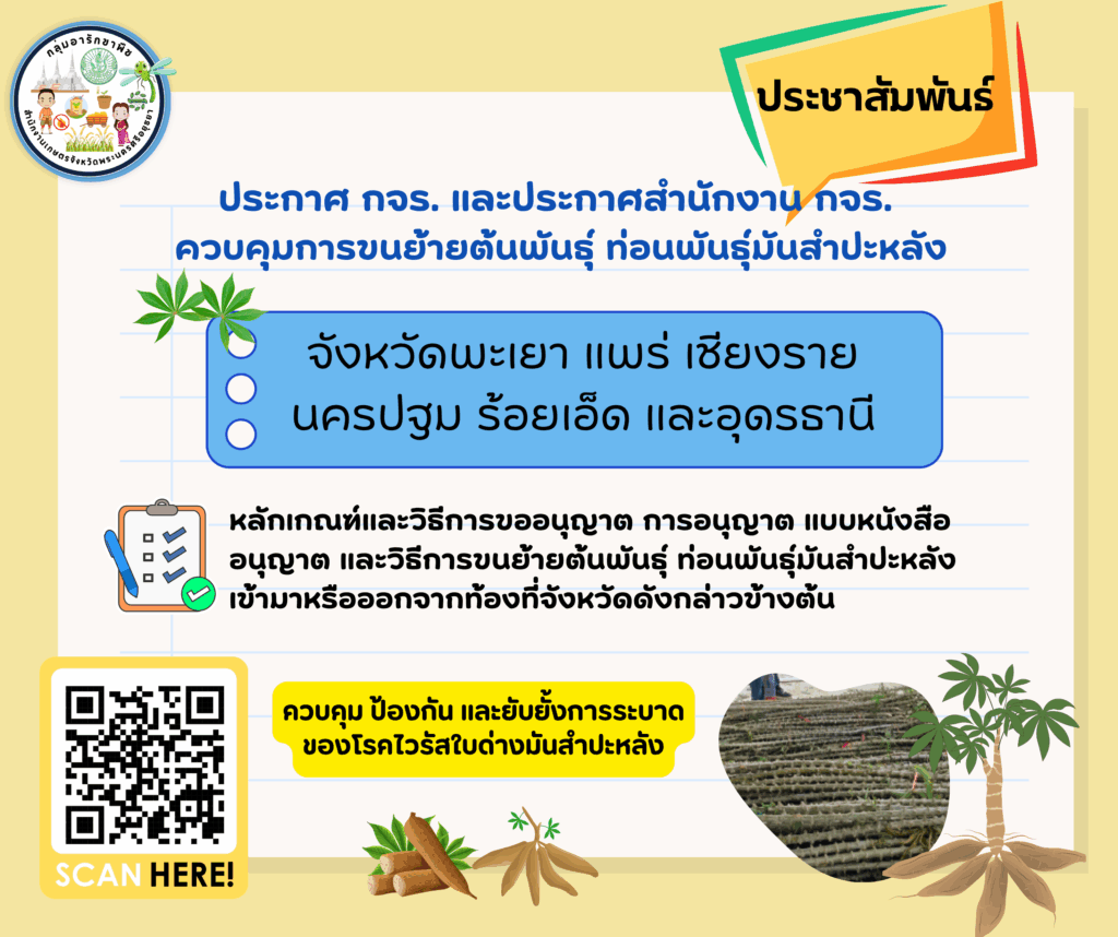 ข่าวประกาศ/ประชาสัมพันธ์ประกาศ กจร. และประกาศสำนักงาน กจร. ควบคุมการขนย้ายต้นพันธุ์ ท่อนพันธุ์มันสำปะหลัง ayutthaya_doae / 03/10/2025 📢 ประชาสัมพันธ์ประกา