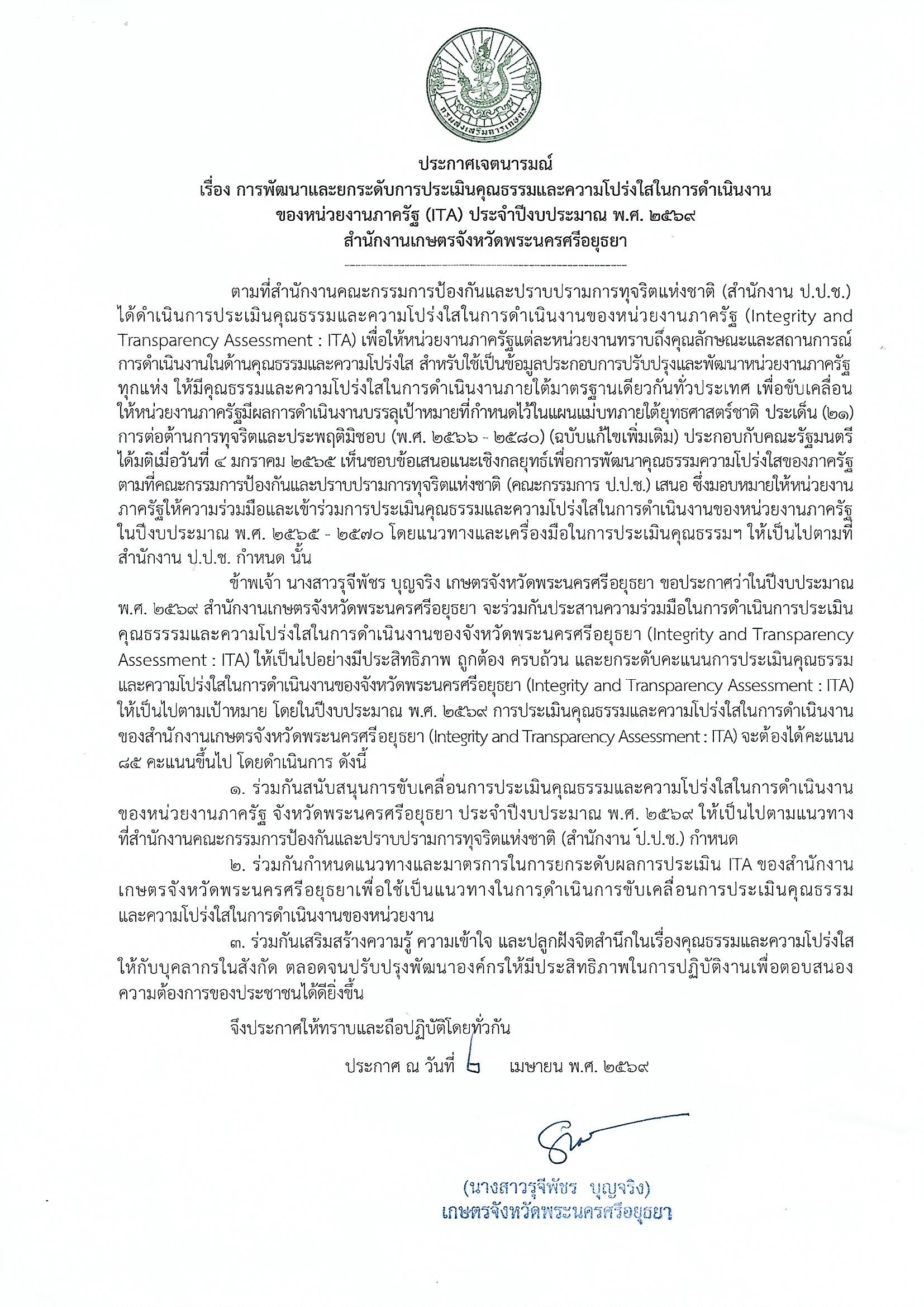 ประกาศเจตนารมณ์ เรื่อง การพัฒนาและยกระดับการประเมินคุณธรรมและความโปร่งใสในการดำเนินงานของหน่วยงานภาครัฐ (ITA) ประจำปีงบประมาณ พ.ศ. 2569 สำนักงานเกษตรจังหวัดพระนครศรีอยุธยาBy ayutthaya_doae / 02/04/2026