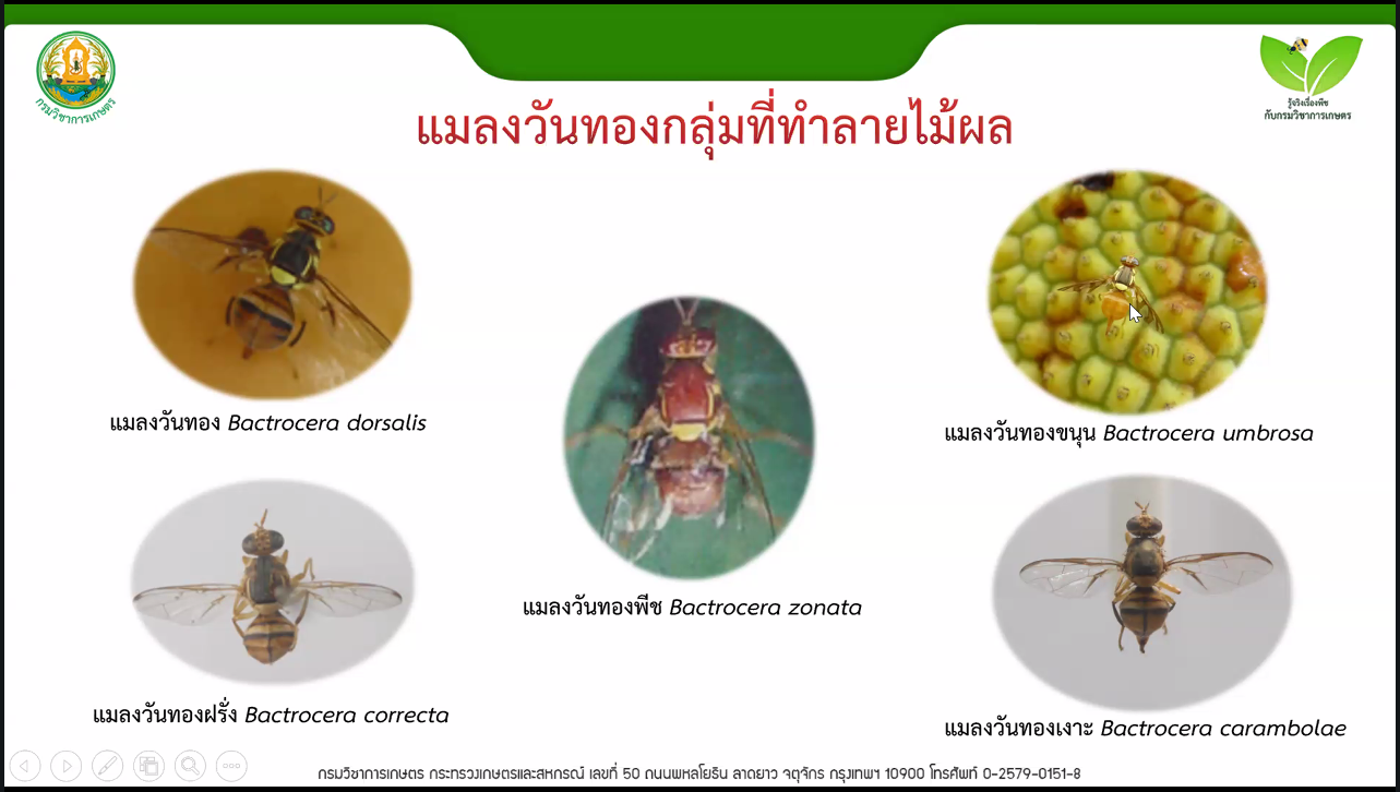 วันศุกร์ที่ 12 กันยายน 2568 นางสาวกลอยตา แก้วเกษ นักวิชาการส่งเสริมการเกษตรชำนาญการ กลุ่มอารักขาพืช สำนักงานเกษตรจังหวัดพระนครศรีอยุธยา เข้าร่วมอบรมพัฒนาเจ้าหน้าที่ หลักสูตร การจัดการแมลงวันผลไม้แบบครอบคลุมพื้นที่ ผ่านระบบออนไลน์ (Zoom Meeting) จัดโดยกองส่งเสริมการอารักขาพืชและจัดการดินปุ๋ย กรมส่งเสริมการเกษตร โดยมี นางดวงสมร พฤฑฒิกุล ผู้อำนวยการกองส่งเสริมการอารักขาพืชและจัดการดินปุ๋ย เป็นประธานในพิธีเปิดการอบรมฯ วัตถุประสงค์เพื่อพัฒนาเจ้าหน้าที่กรมส่งเสริมการเกษตรให้มีความรู้และทักษะในการวางแผนและดำเนินการควบคุมแมลงวันผลไม้แบบครอบคลุมพื้นที่ (Area-wide Pest Management : AWPM) ได้อย่างถูกต้องและมีประสิทธิภาพ หัวข้อการอบรมประกอบด้วย ชนิดของแมลงวันผลไม้ที่สำคัญ และการป้องกันกำจัด หลักการควบคุมศัตรูพืชโดยวิธีผสมผสานแบบครอบคุลมพื้นที่ และการกำหนดขอบเขตพื้นที่ในการดำเนินกิจกรรมควบคุมแมลงวันผลไม้โดยวิธีผสมผสานแบบครอบคลุมพื้นที่ด้วยระบบภูมิสารสนเทศ มีเจ้าหน้าที่จากส่วนกลาง ส่วนภูมิภาค และเกษตรกร เข้าร่วมกว่า 700 ราย
