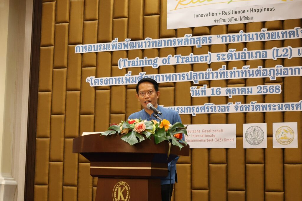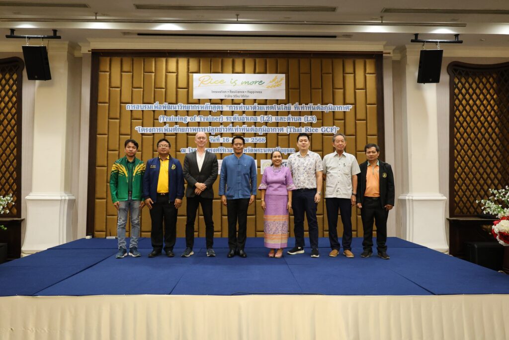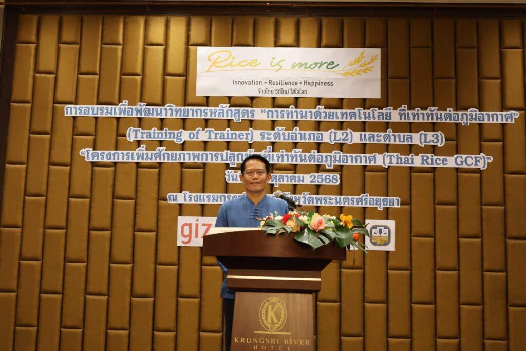 ดร.รุจีพัชร บุญจริง เกษตรจังหวัดพระนครศรีอยุธยา พร้อมด้วยหัวหน้ากลุ่ม เกษตรอำเภอ นักวิชาการส่งเสริมการเกษตร เจ้าหน้าที่ธนาคารเพื่อการเกษตรและสหกรณ์การเกษตร (ธ.ก.ส.) และเจ้าหน้าที่ศูนย์วิจัยข้าวพระนครศรีอยุธยา เข้าร่วมการประชุมเชิงปฏิบัติการเพื่อพัฒนาวิทยากรถ่ายทอดความรู้การปลูกข้าวที่เท่าทันต่อภูมิอากาศ (Training to Trainer) ระดับอำเภอ (L2) และตำบล (L3) ตามโครงการเพิ่มศักยภาพการปลูกข้าวที่เท่าทันภูมิอากาศ (Thai Rice GCF) ณ โรงแรมกรุงศรีริเวอร์ จังหวัดพระนครศรีอยุธยา ทั้งนี้ ได้รับเกียรติจาก นายเดชาธร เชาว์เลขา ปลัดจังหวัดพระนครศรีอยุธยา เป็นประธานในพิธีเปิดงาน โดยการจัดกิจกรรมในวันนี้มีวัตถุประสงค์เพื่อสร้างทีมวิทยากรในการถ่ายทอดความรู้ ให้เกษตรกรในการปรับเปลี่ยนกระบวนทัศน์ ไปสู่การทำนาคาร์บอนต่ำ และ สร้างศักยภาพในการปรับตัวต่อการเปลี่ยนแปลงของภูมิอากาศ