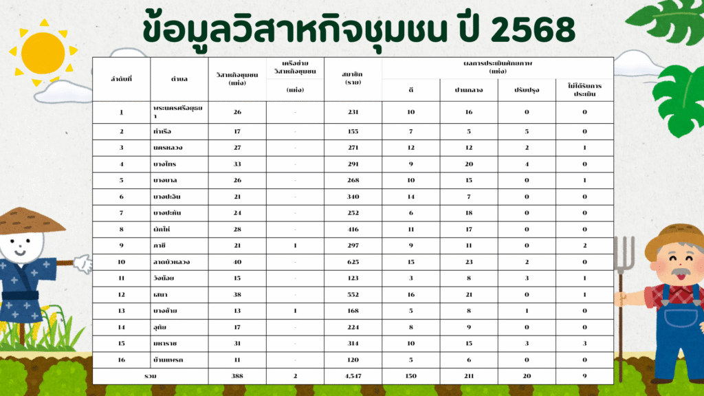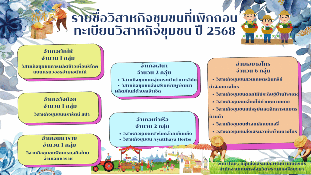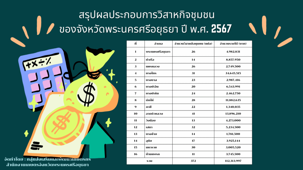 วิสาหกิจชุมชน ข้อมูลวิสาหกิจชุมชน ปี 2568 ผลประกอบการวิสาหกิจชุมชน จังหวัดพระนครศรีอยุธยา ปี 2567 รายชื่อวิสาหกิจชุมชนที่ถูกเพิกถอน